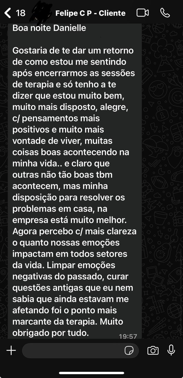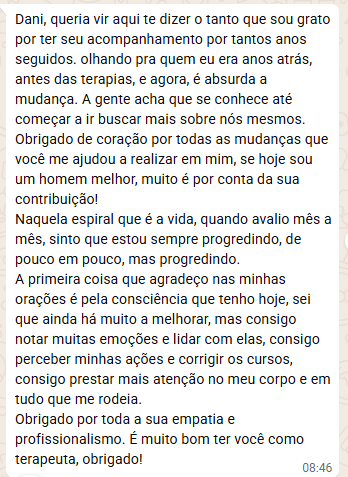 Vamos realizar uma conversa terapêutica bem acolhedora, onde você vai me dizer como você está emocionalmente e fisicamente e compartilhar um pouco sobre a sua história e os desafios que vem enfrentando.